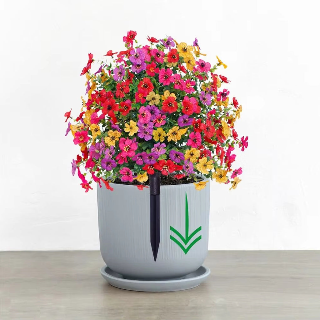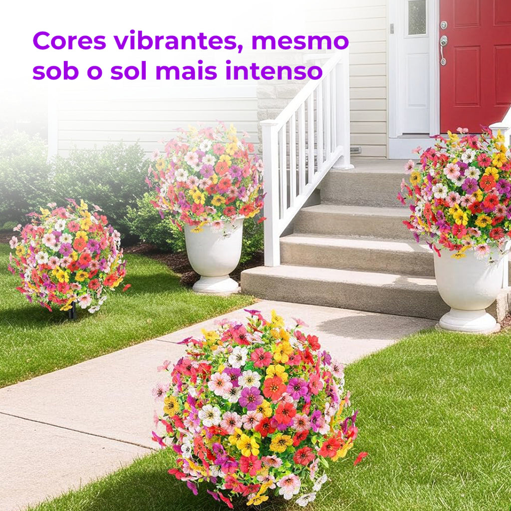 Quem já comprou flor artificial barata sabe como termina: dois meses no sol e tá tudo amarelado, desbotado, com cara de abandono, pior do que não ter nada. O VividBloom tem proteção UV de alta resistência embutida em cada pétala, desenvolvida pra refletir a radiação solar ao invés de absorvê-la. Isso significa que ele enfrenta sol, chuva, calor e frio mantendo as cores vibrantes exatamente como no dia que chegou. Verão inteiro. Inverno inteiro. Ano após ano.